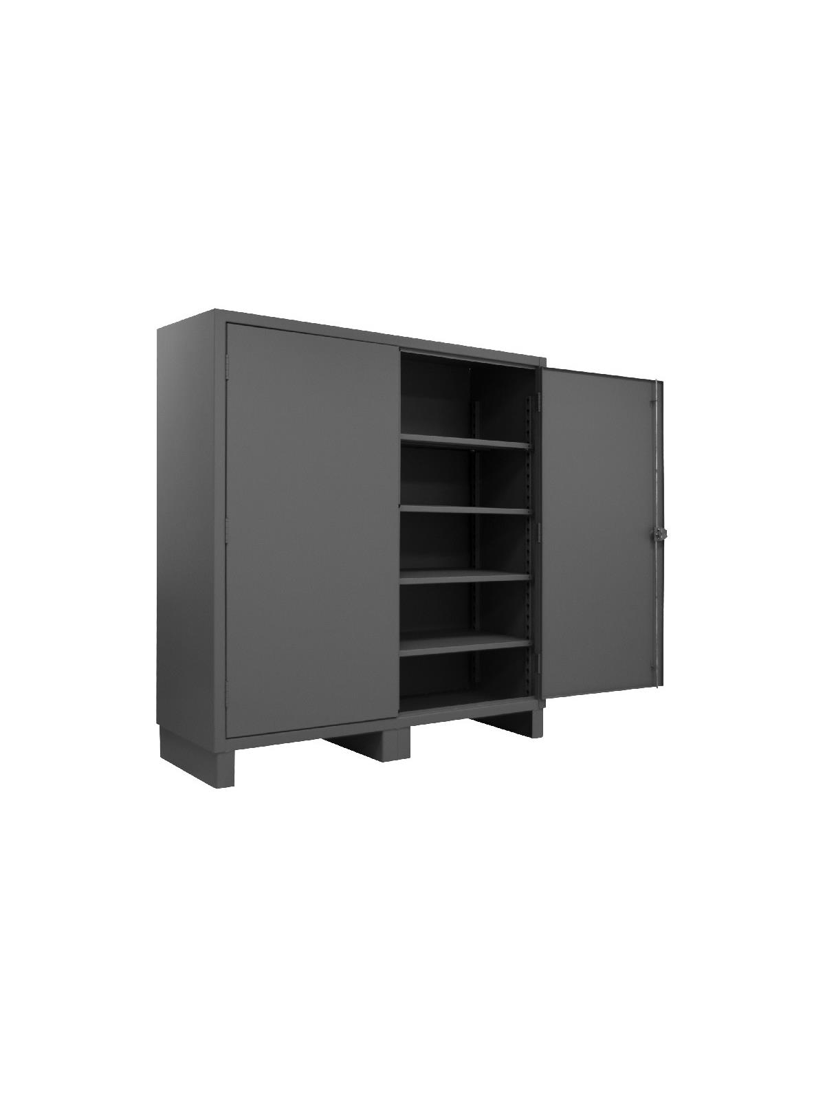 Feature rugged, all-welded 12 ga. steel construction and handsome flush door design. 4 reinforced steel shelves are adjustable on 2-1/2” centers. Includes extra heavy-duty hinge pins that secure doors to avoid sagging. Sturdy 3-point, cast steel locking handles have 3/8” dia. rods and provision for padlock (padlock not furnished).  6" high box style legs offer space for lift truck forks and can be lagged to the floor, constructed of 3/16" steel. Durable Gray powder coat finish. FOB Shipping Point.