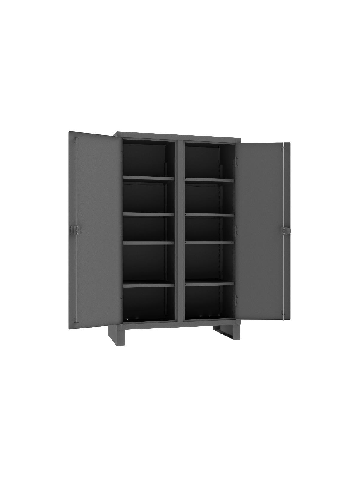 Feature rugged, all-welded 12 ga. steel construction and handsome flush door design. 4 reinforced steel shelves are adjustable on 2-1/2” centers. Includes extra heavy-duty hinge pins that secure doors to avoid sagging. Sturdy 3-point, cast steel locking handles have 3/8” dia. rods and provision for padlock (padlock not furnished).  6" high box style legs offer space for lift truck forks and can be lagged to the floor, constructed of 3/16" steel. Durable Gray powder coat finish. FOB Shipping Point.