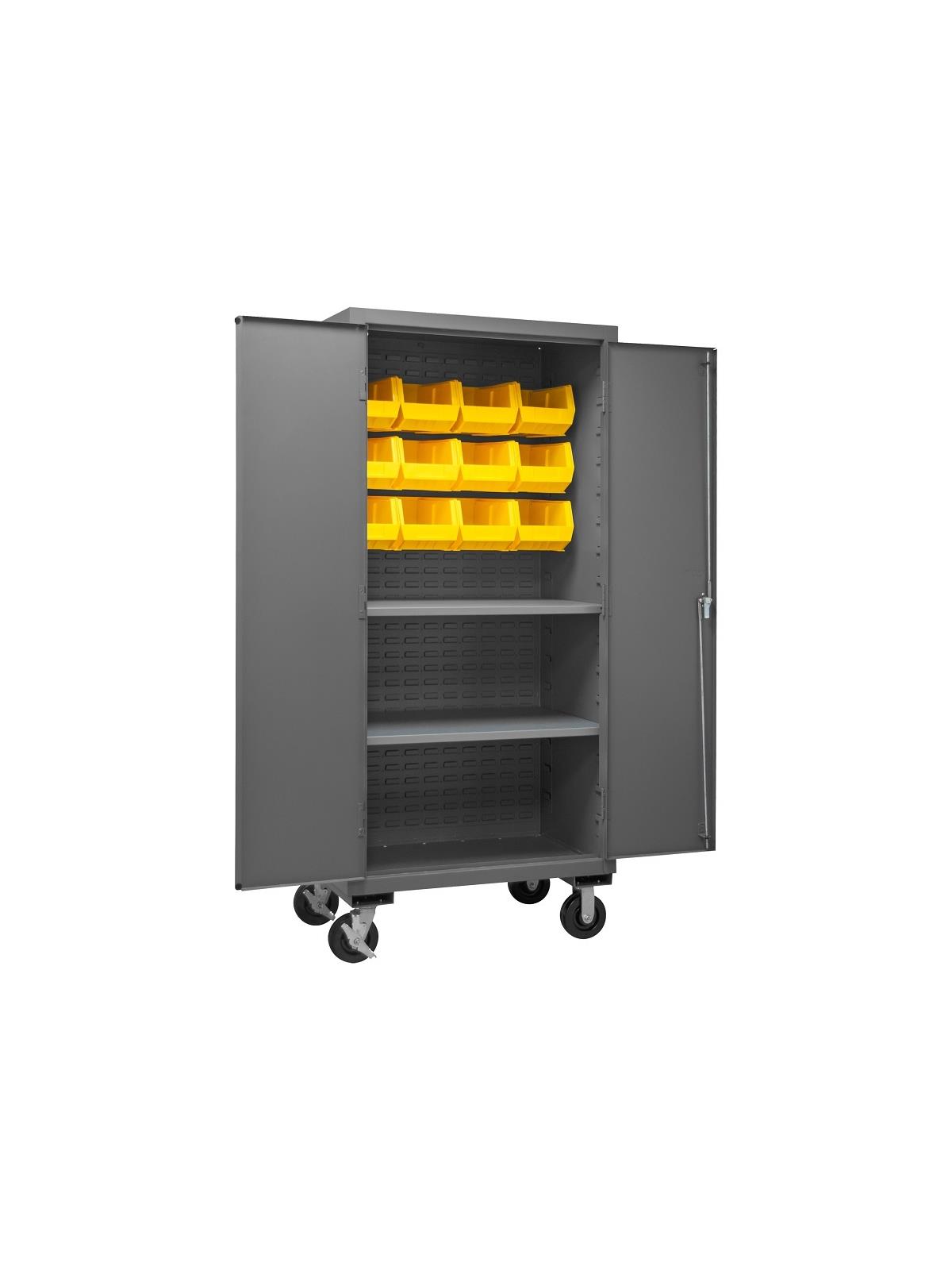 Heavy duty, all welded 14-gauge steel with 6" x 2" phenolic casters (2 rigid, 2 locking swivel). 3-point locking system with keyed handle and lock rods, 4 keys included. Side handle for easy maneuvering. Fully welded louvered panels reinforce back and hold Hook-On-Bins® and adjustable shelves rest on louvered panels and adjust on 4"centers. No tools required for installation. Hook-On-Bins® by Durham are included and install with no tools required. Gray textured powder coat finish. Available in three bin colors, Red (-1795), Blue (-5295), or Yellow (-95). FOB Shipping Point. Steel surcharges may apply.