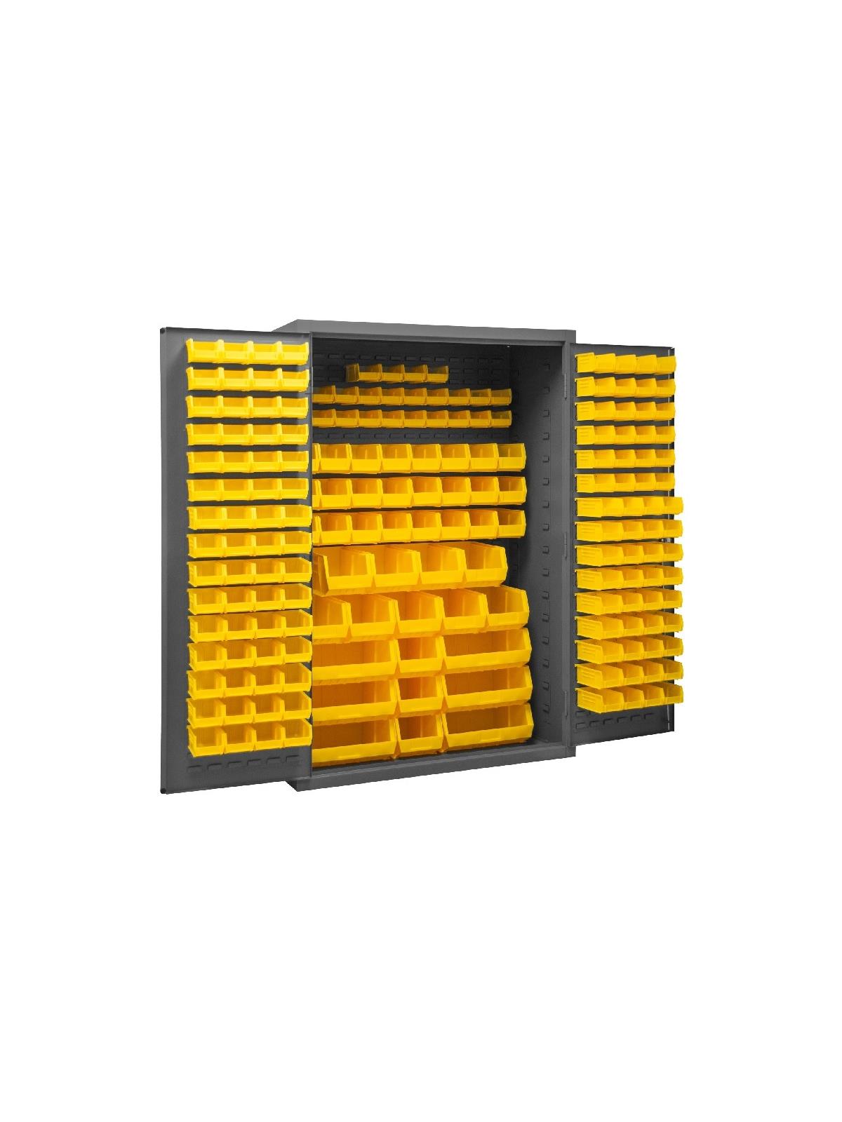 3-point locking system with keyed handle and lock rods, 4 keys included. Full height, formed and recessed doors with heavy duty, leaf hinges to prevent sagging and warping. Fully welded louvered panels reinforce door and accommodates Hook-On-Bins®. Hook-On-Bins® installed easily with no tools required. Hook-On-Bins® are included. Durable, gray textured powder coat finish. Available in three bin colors, Red (-1795), Blue (-5295), or Yellow (-95). FOB Shipping Point. Steel surcharges may apply.