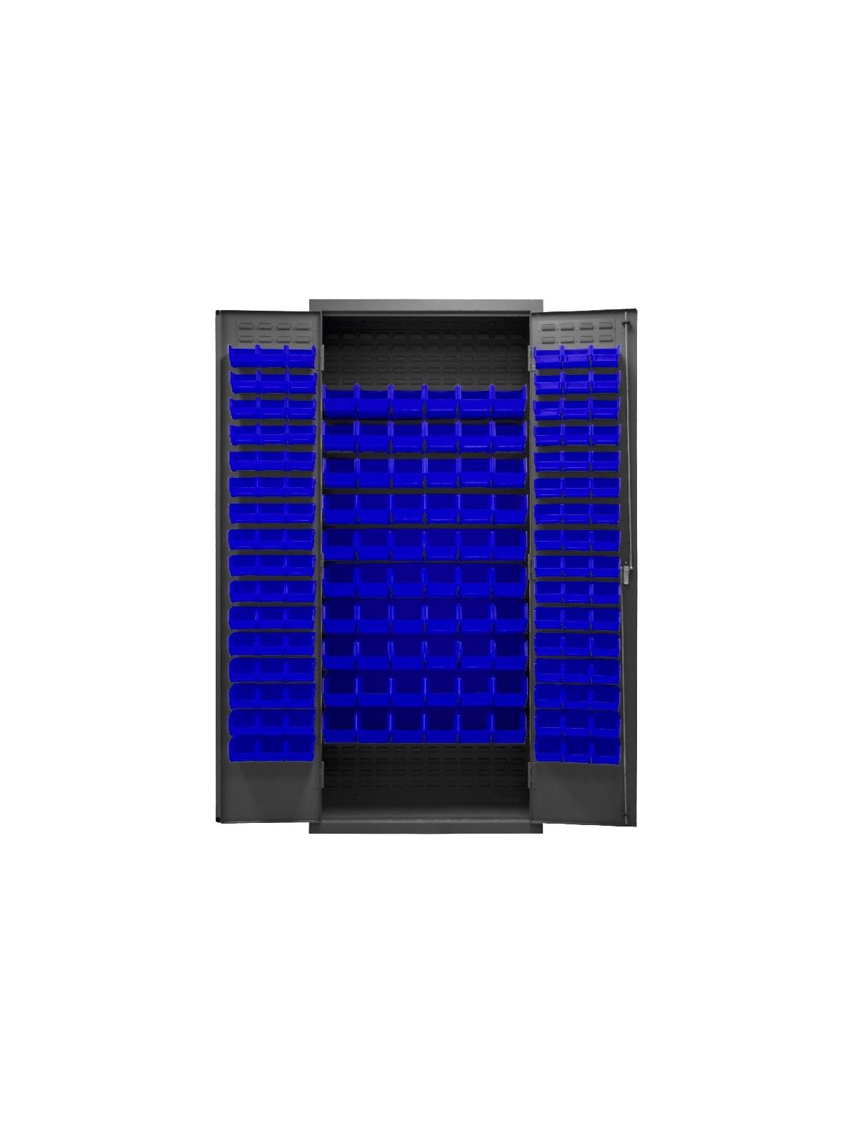 3-point locking system with keyed handle and lock rods, 4 keys included. Full height, formed and recessed doors with heavy duty, leaf hinges to prevent sagging and warping. Fully welded louvered panels reinforce door and accommodates Hook-On-Bins®. Hook-On-Bins® installed easily with no tools required. Hook-On-Bins® are included. Durable, gray textured powder coat finish. Available in three bin colors, Red (-1795), Blue (-5295), or Yellow (-95). FOB Shipping Point.