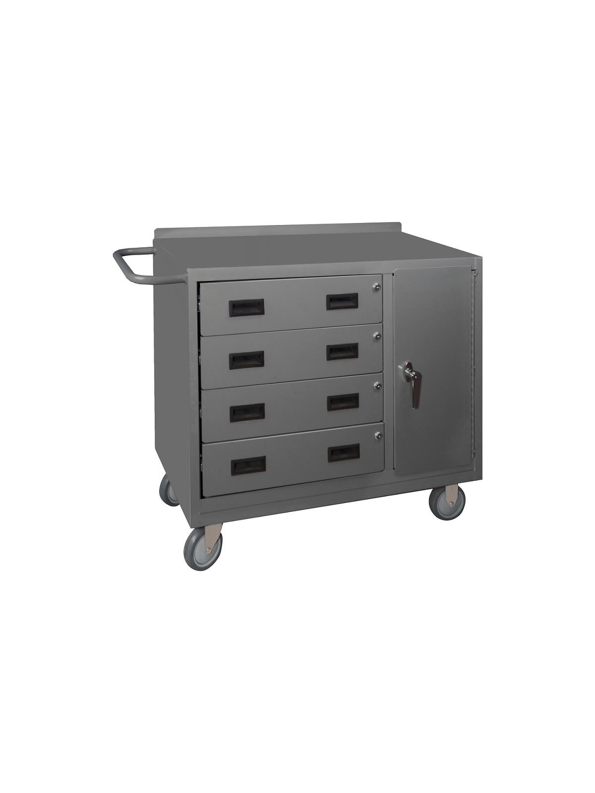 Smooth ball bearing slide drawers are complete with recessed pull handle and cylinder lock. These cabinets deliver top quality without a top price. Easy swing doors on full piano hinge and single point locking handles. Drawers measure 20-7/16"W x 14-11/16"D x 5-7/8"H. Rolls on 5" polyurethane casters (2 rigid, 2 swivel). Complete with push handle. HEMC models have 3"H. back stop. Supplied with keyed-alike cylinder locks. Gray powder coat finish. FOB Shipping Point. Steel surcharges may apply.