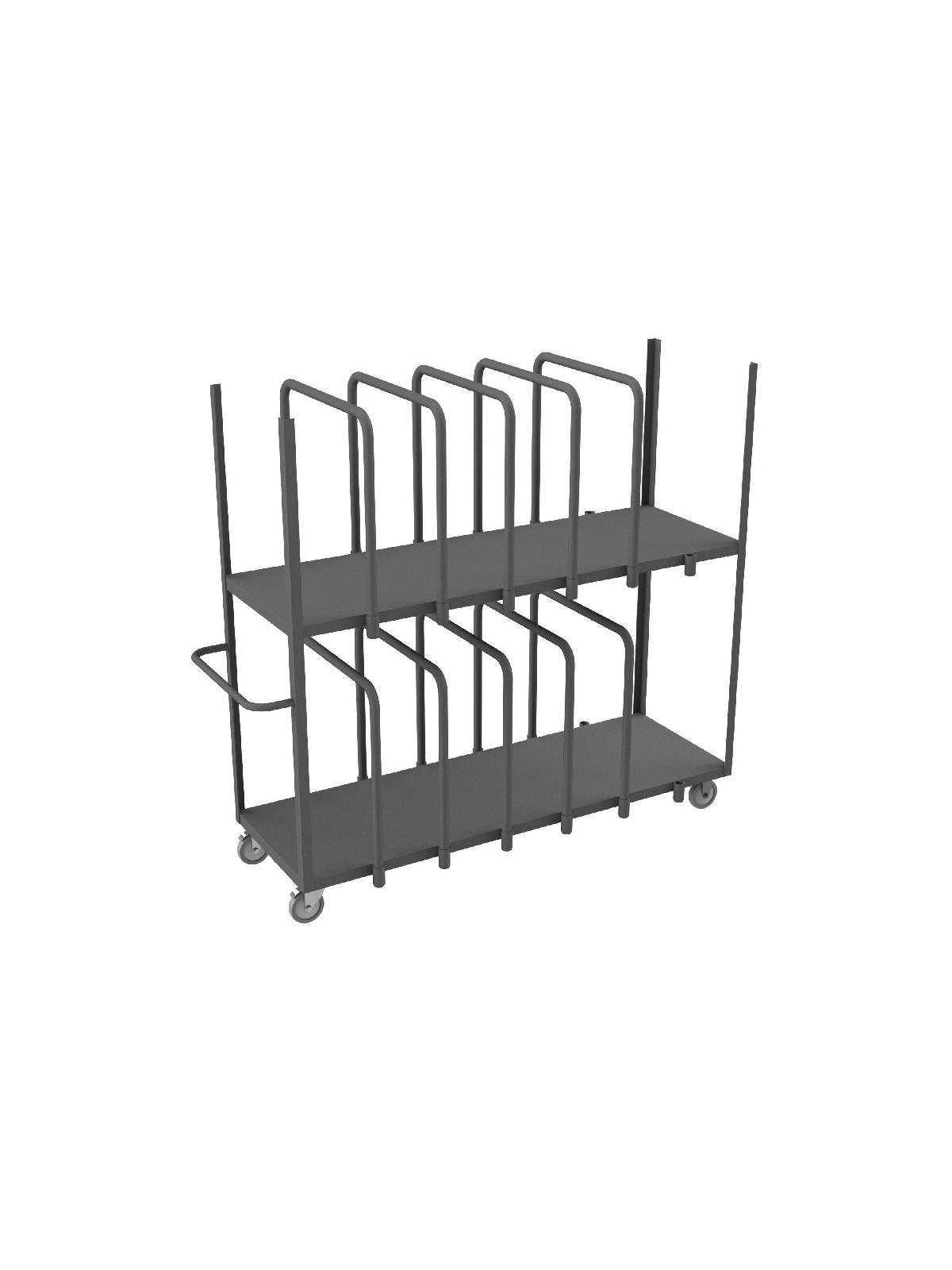 Easy to access and pick up on-board product. Create multiple opening sizes by adjusting dividers. All casters: 2 rigid, 2 swivel. Allows for the storage and transportation of various sizes of panels and product. Gray, textured, powder coat finish. FOB Shipping Point.