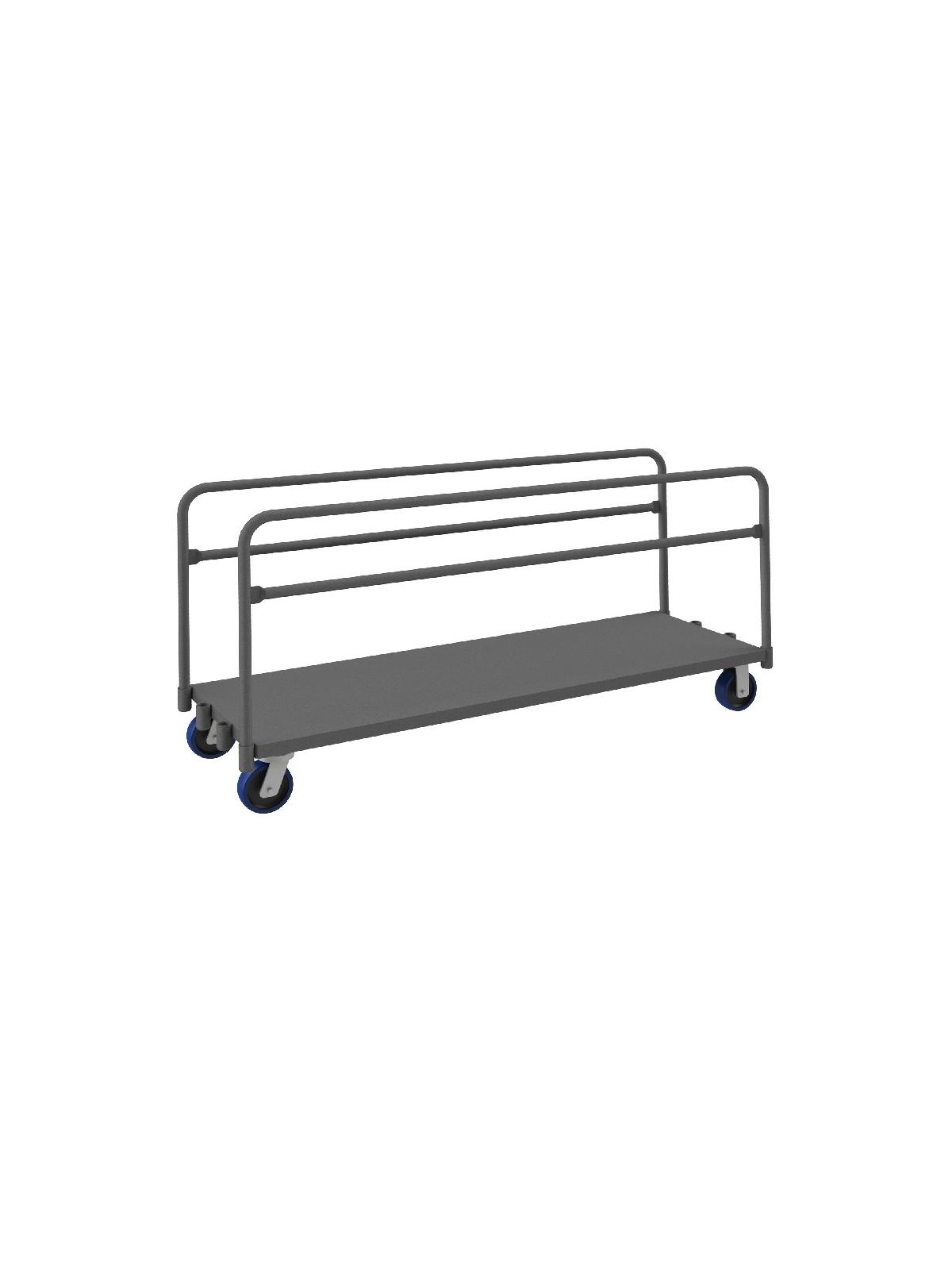 Easy to access and pick up on-board product. Create multiple opening sizes by adjusting dividers. All casters: 2 rigid, 2 swivel. Allows for the storage and transportation of various sizes of panels and product. Gray, textured, powder coat finish. FOB Shipping Point.