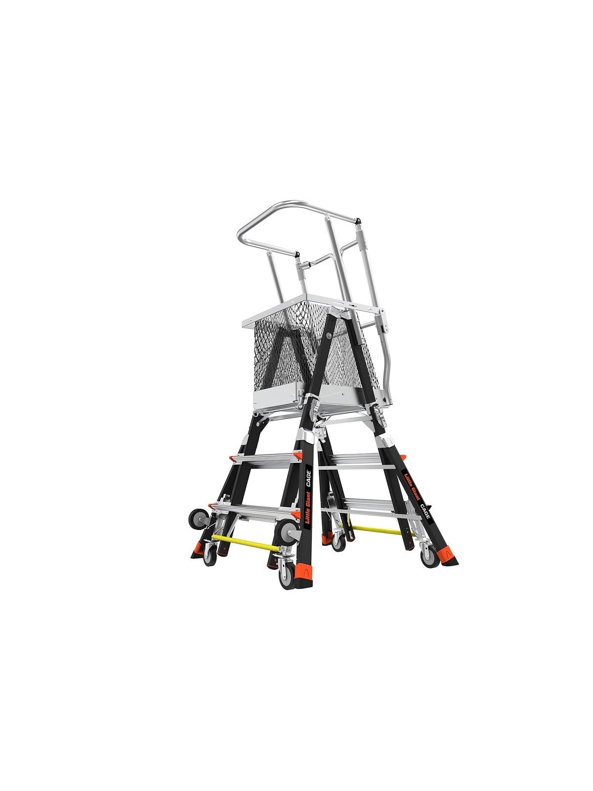 The Cage is constructed of non-conductive, high strength fiberglass-resin composite and is fully adjustable in one-foot increments, allowing the operator to adjust the platform height to the job at hand. Each side adjusts independently, so operators can also use the Cage over uneven surfaces or stairs, where a mechanical lift or ordinary stepladder could never go. The Cage protects operators in a fully enclosed working platform, allowing them to work safely and quickly with two hands while complying with industry regulations. Time and energy saving Tip & Glide™ Wheels make it quick and easy to move from job to job. Type IAA ANSI Duty rating 377 lb. weight capacity. FOB Shipping Point. Surcharges may apply.