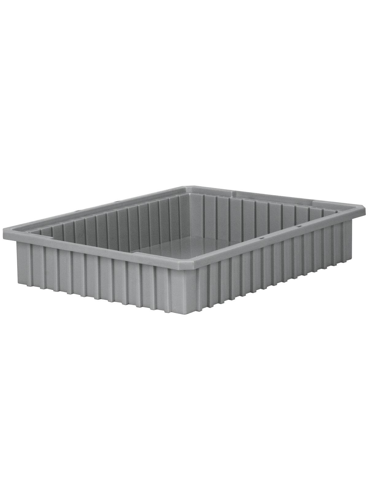 Intersecting dividers allow the container to be subdivided in separate compartments as small as 1-1/8" sq. Injection-molded from high density polyethylene -- resists most solvents and chemicals. Compatible with most racks, shelving and automated material handling equipment. Available in Red, Blue, or Gray. Dividers and lids sold separately. FOB Shipping Point.