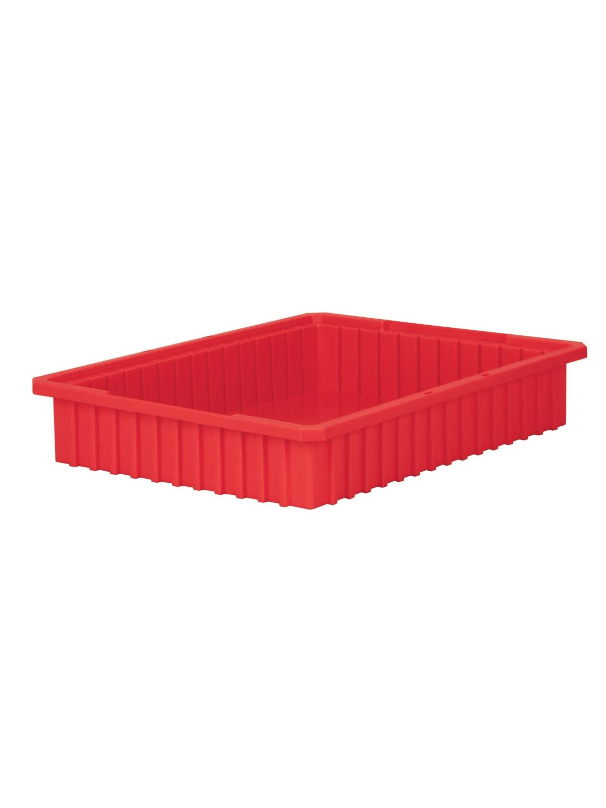 Intersecting dividers allow the container to be subdivided in separate compartments as small as 1-1/8" sq. Injection-molded from high density polyethylene -- resists most solvents and chemicals. Compatible with most racks, shelving and automated material handling equipment. Available in Red, Blue, or Gray. Dividers and lids sold separately. FOB Shipping Point.