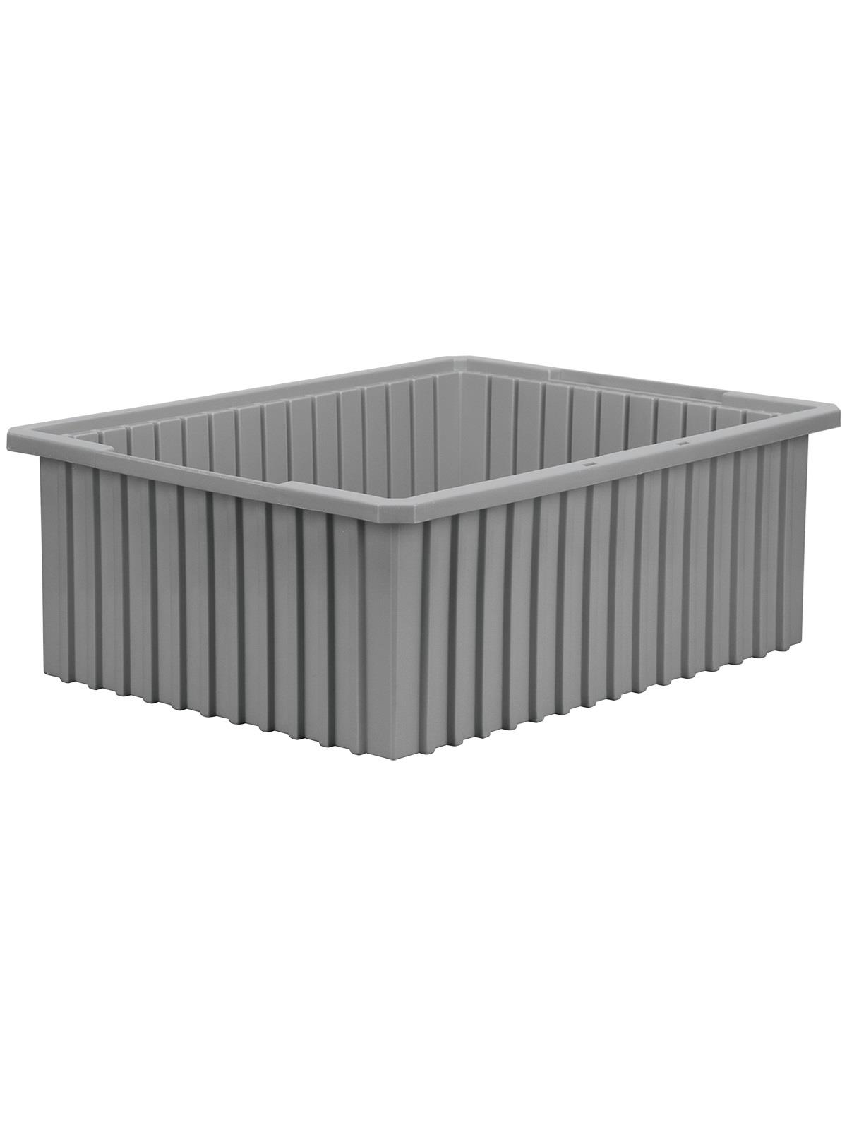 Intersecting dividers allow the container to be subdivided in separate compartments as small as 1-1/8" sq. Injection-molded from high density polyethylene -- resists most solvents and chemicals. Compatible with most racks, shelving and automated material handling equipment. Available in Red, Blue, or Gray. Dividers and lids sold separately. FOB Shipping Point.