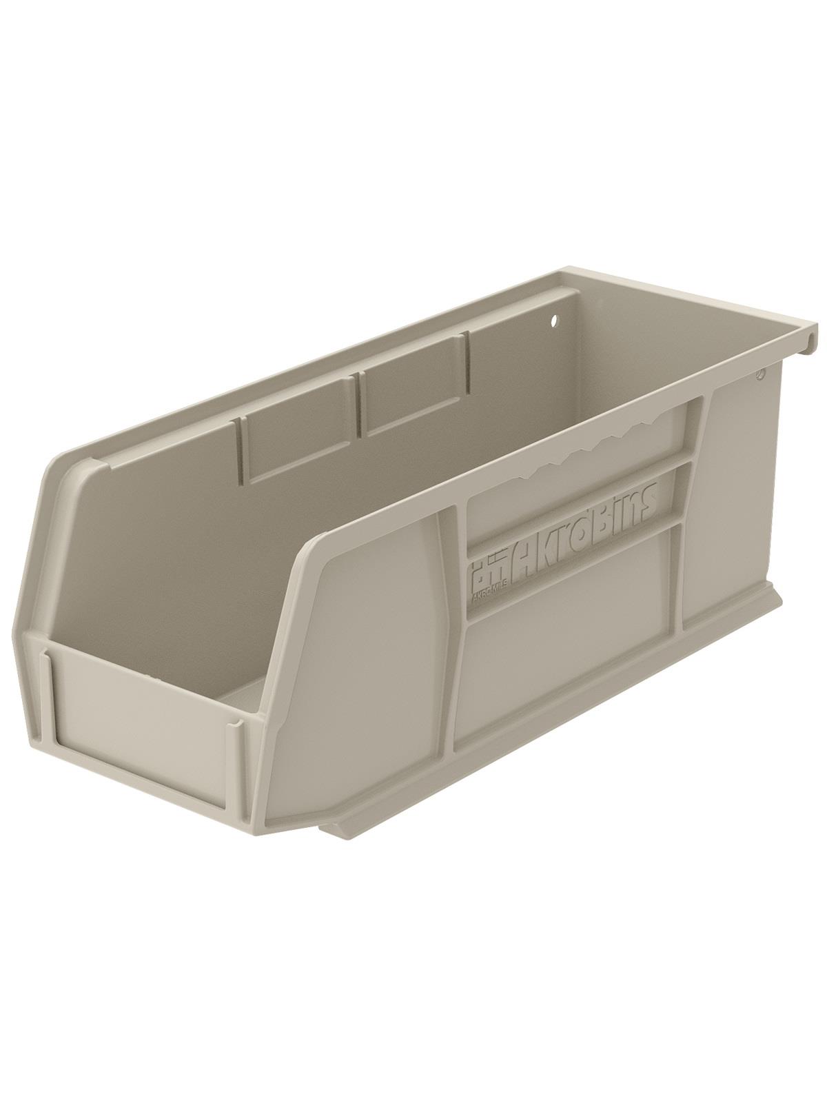 AkroBins are heavy-duty and securely stack on top of each other, sit on shelving, and hang from Akro-Mils racks, panels, rails and carts. Unaffected by weak acids and alkalis the sturdy one piece construction is water, rust and corrosion-proof. Finger grip allows for easy handling. Large label slot for easy identification of contents. Autoclavable up to 250° F. Guaranteed not to crack or break under normal load conditions as stated in the 1-year limited warranty. Optional dividers and labels available, see Related Items tab. AkroBins available in Red, Yellow, Blue, Green, Black, Stone, and Semi-Clear. FOB Shipping Point.