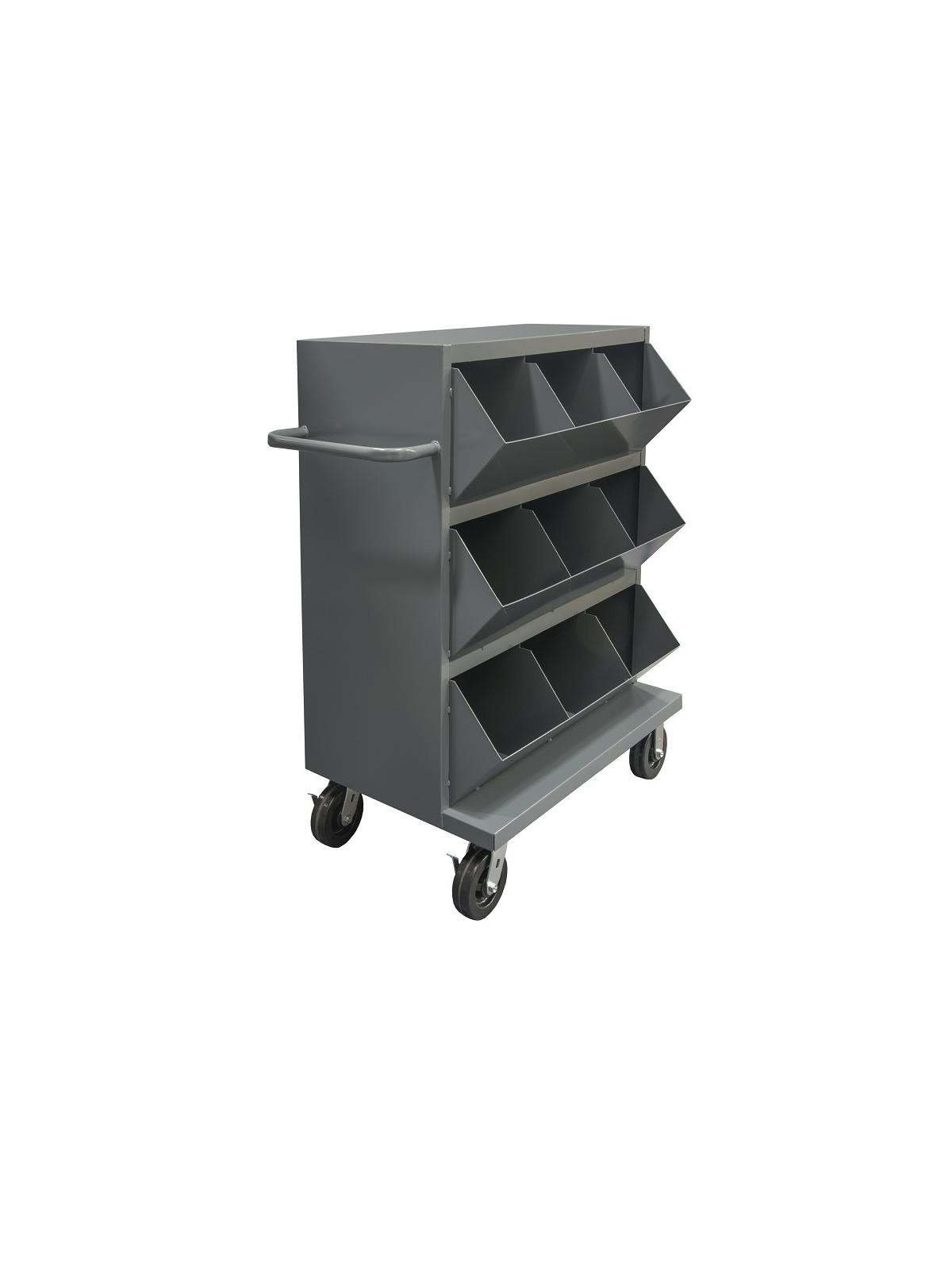 Bin opening incorporates a slope design of 6" high. Choice of 3, 6, 12, or 19 open face bins. Has 6 x 2" bolt-on phenolic casters, 2 locking swivel and 2 rigid. Sturdy, tubular push handle. Top shelf is 49-1/4" above the floor. Shelf clearance is 13-3/8". Ships fully assembled, ready to use. FOB Shipping Point.