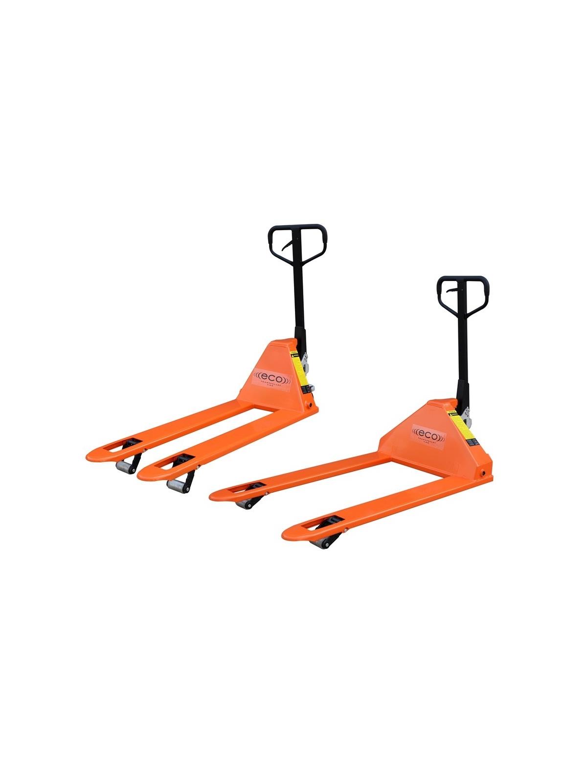 Designed for rugged, constant, heavy duty performance. Easy to use and maneuverable trucks feature polyurethane wheels and steel rollers, adjustable push rods, robotic welds, quality bearings throughout, grease fittings and bushings at all pivot points. Includes entry/exit rollers and an overload bypass system. Only 10 strokes to maximum lift. The H1203248 Pallet Truck is designed for 4-way pallets. FOB Shipping Point. 25% Steel surcharge may be added. See Related Items tab for Eco I-55 Standard & Custom Fork Size Trucks.