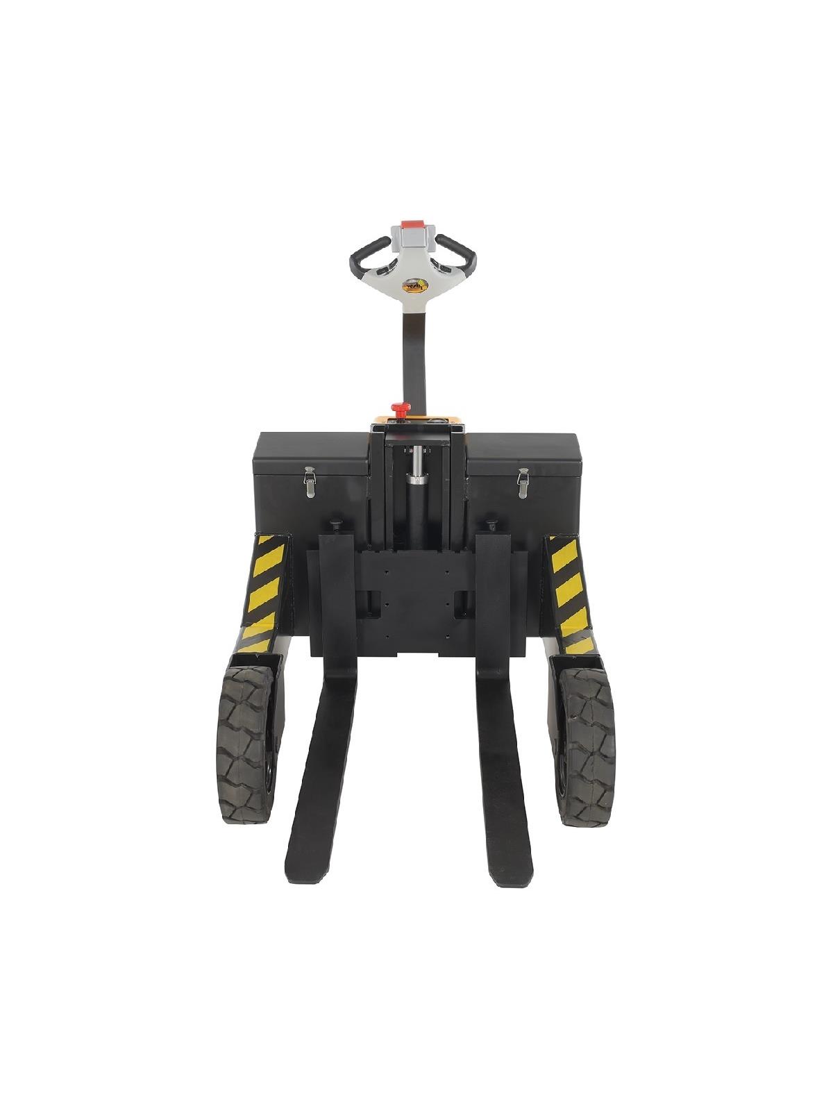 An Electric powered rough terrain pallet truck is perfect for quick operation. Large wheels allow for movement over most surfaces. Maneuver loads in warehouses, construction sites, gravel pits and nurseries. Ergonomic handle features easy to operate throttle with infinite adjustment of forward and reverse speeds, lift/lower controls, emergency reverse-function and horn. Truck rolls smoothly on 16" front and 11-13/16" rear rubber tires. The truck operates through DC power, while the drive motor utilizes AC drive technology. The unit comes equipped with (2) 12V batteries, integral battery charge, and battery level indicator. FOB Shipping Point. Due to tariffs and market conditions, pricing subject to change.