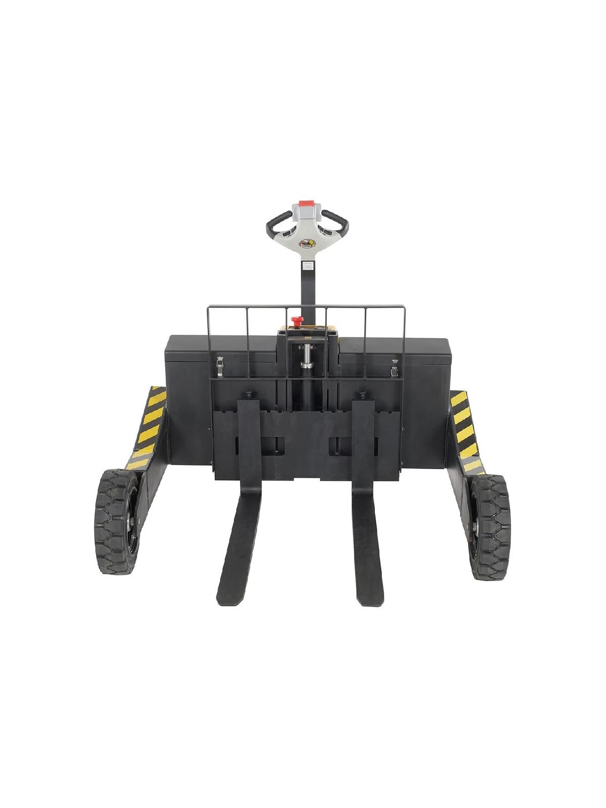 An Electric powered rough terrain pallet truck is perfect for quick operation. Large wheels allow for movement over most surfaces. Maneuver loads in warehouses, construction sites, gravel pits and nurseries. Ergonomic handle features easy to operate throttle with infinite adjustment of forward and reverse speeds, lift/lower controls, emergency reverse-function and horn. Truck rolls smoothly on 16" front and 11-13/16" rear rubber tires. The truck operates through DC power, while the drive motor utilizes AC drive technology. The unit comes equipped with (2) 12V batteries, integral battery charge, and battery level indicator. FOB Shipping Point. Due to tariffs and market conditions, pricing subject to change.