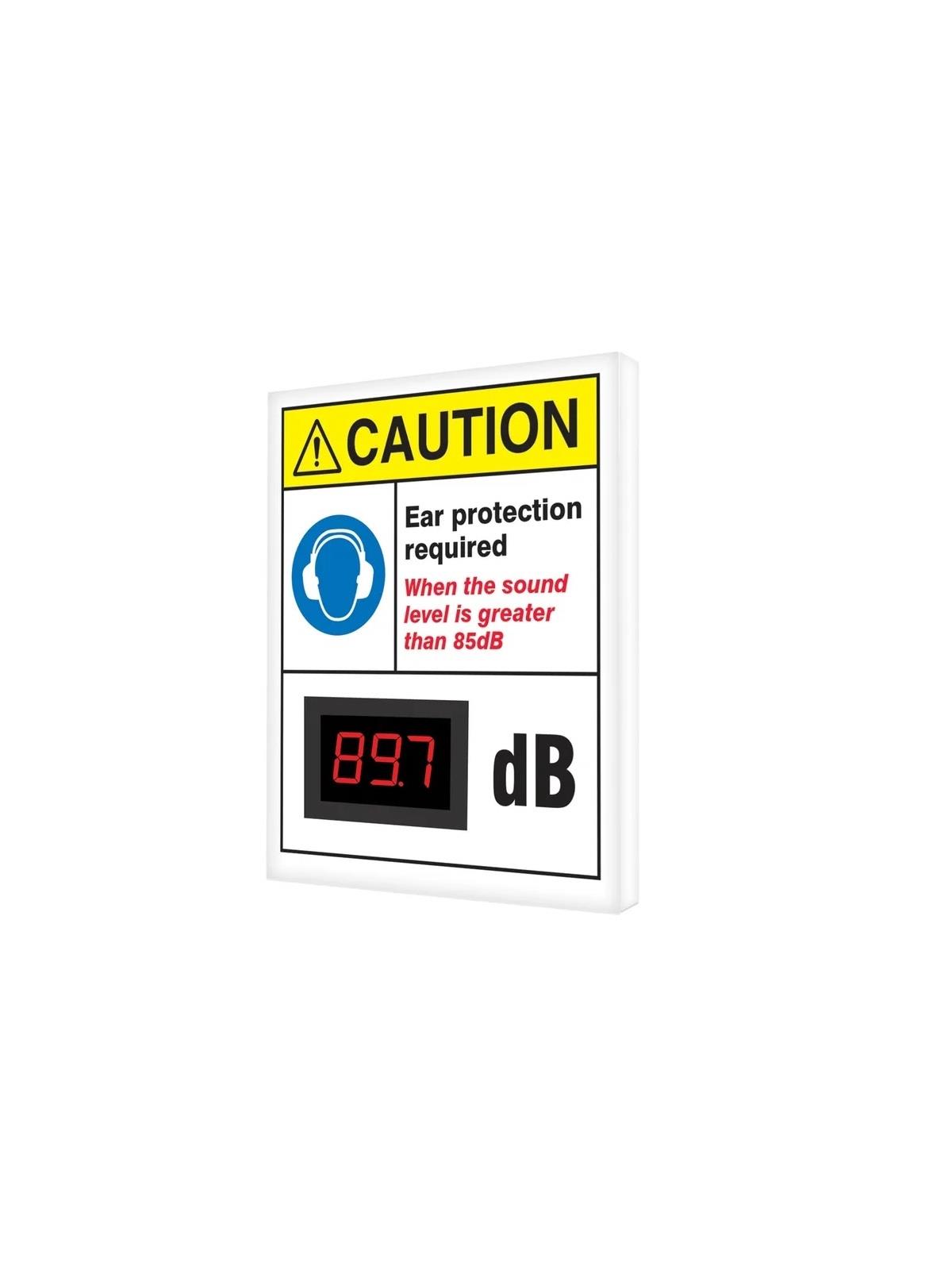 Electronic decibel meter signs constantly measure and display decibel level for employee safety. Encourage workers to use ear protection when sound levels are elevated and become a hazard to them. Striking visual edge safety sign captures employees' attention. Supports OSHA Standard 1910.95 that states employers must have in place an effective hearing conservation program whenever noise exposure equals or exceeds 85 db for 8 hours. FOB Shipping Point.
