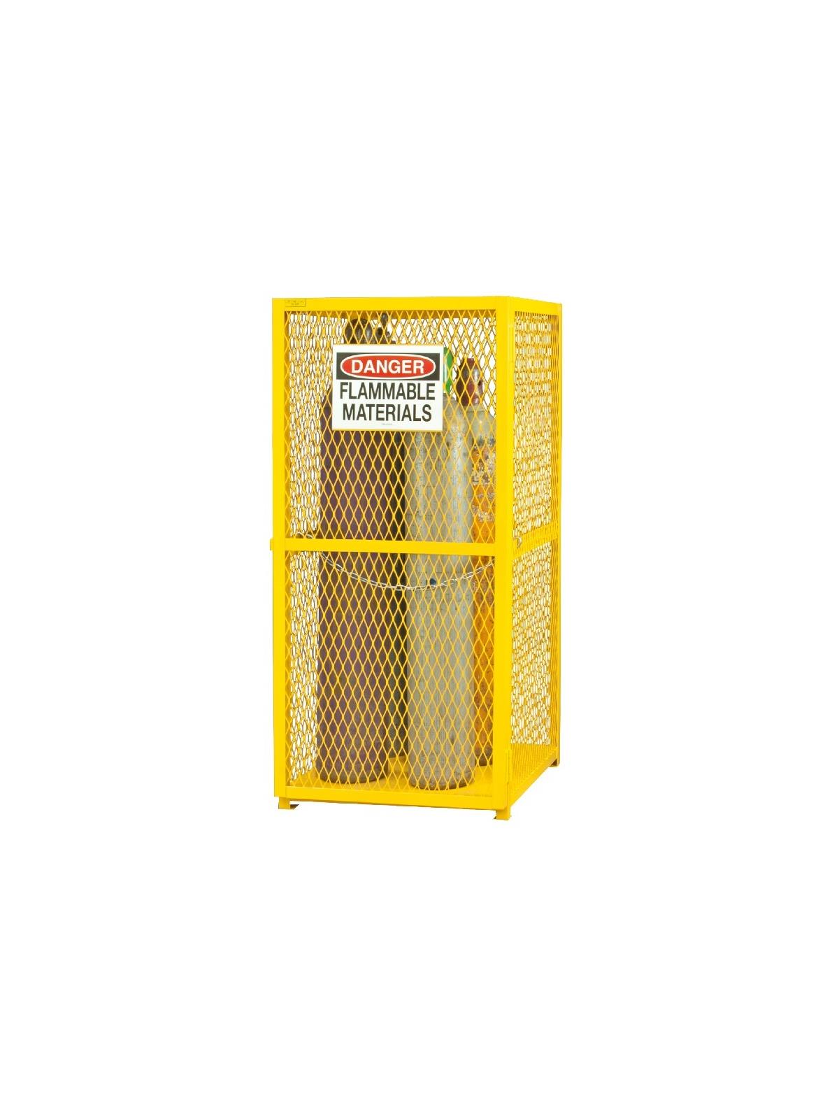 Lockable cabinets store cylinders of fuel, LP gases and other flammable materials on easy-to-access cylinder cradles. "DANGER FLAMMABLE MATERIALS" signs on each door. Magnetic catch keeps doors safely shut when not locked. Heavy-duty butt hinges keep doors from sagging. Includes padlock hasp to secure contents - padlock not furnished. Made of sturdy 1-1/2" x 1/8" angle iron frame. Pre-drilled holes for lagging to floor. Durable, rust and acid resistant safety Yellow powder coat finish. When used properly, units are in full compliance with OSHA and NFPA standards. FOB Shipping Point.