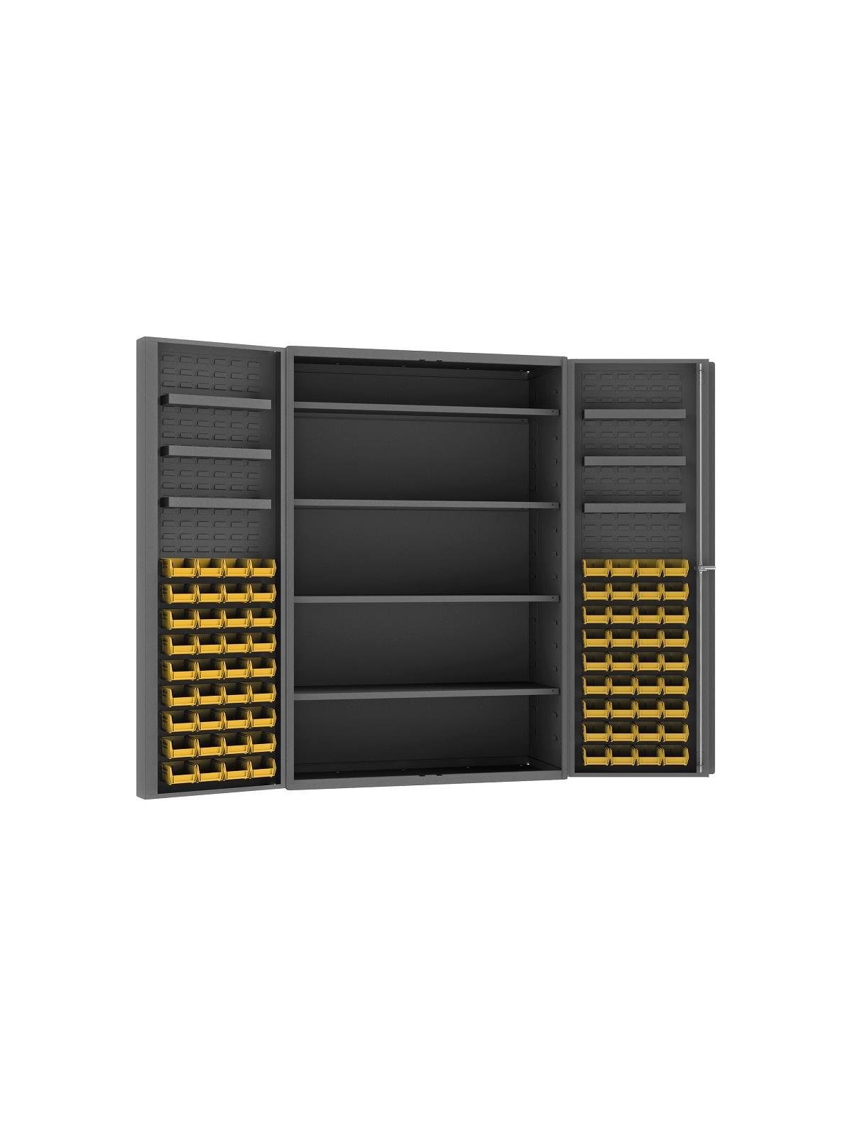 Heavy-duty, all welded 14 gauge steel construction. 3-point locking handle with 5/16" dia. rods and a provision for padlock. Models HJC-171, HSSC-227, and HSSC-185-3S have 6" high box style legs which offer space for lift truck forks making the entire units forkliftable and can be lagged to the floor. Legs are constructed of 3/16" steel. All cabinets feature heavy-duty leaf hinges to prevent warping and sagging. Fully loaded doors can hold up to 650 lbs. Finished in durable Gray powder coat. FOB Shipping Point. Steel surcharges may apply.
