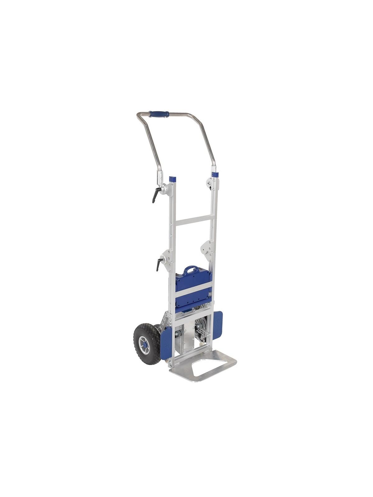 Powered Stair Climber powered with electric lifting/lowering system is ideal to transport light to medium duty and awkward loads up and down stairs. Ideal for copiers, copy paper, filing cabinets, furniture and appliances. Stair climber handles the load up/down stairs and the operator only balances the load. Combined powered stair climber and hand truck that is light weight but lifts load 10 times more than its own weight. Brake activates automatically when going down stairs. Ergo handle with easily accessible raise/lower switch. Folds down to approximately 31". Equipped with maintenance-free 48V/8.8 Ah light weight, high quality and easy to replace Lithium-ion battery. Built-in battery charger indicator. Durable aluminum alloy construction.