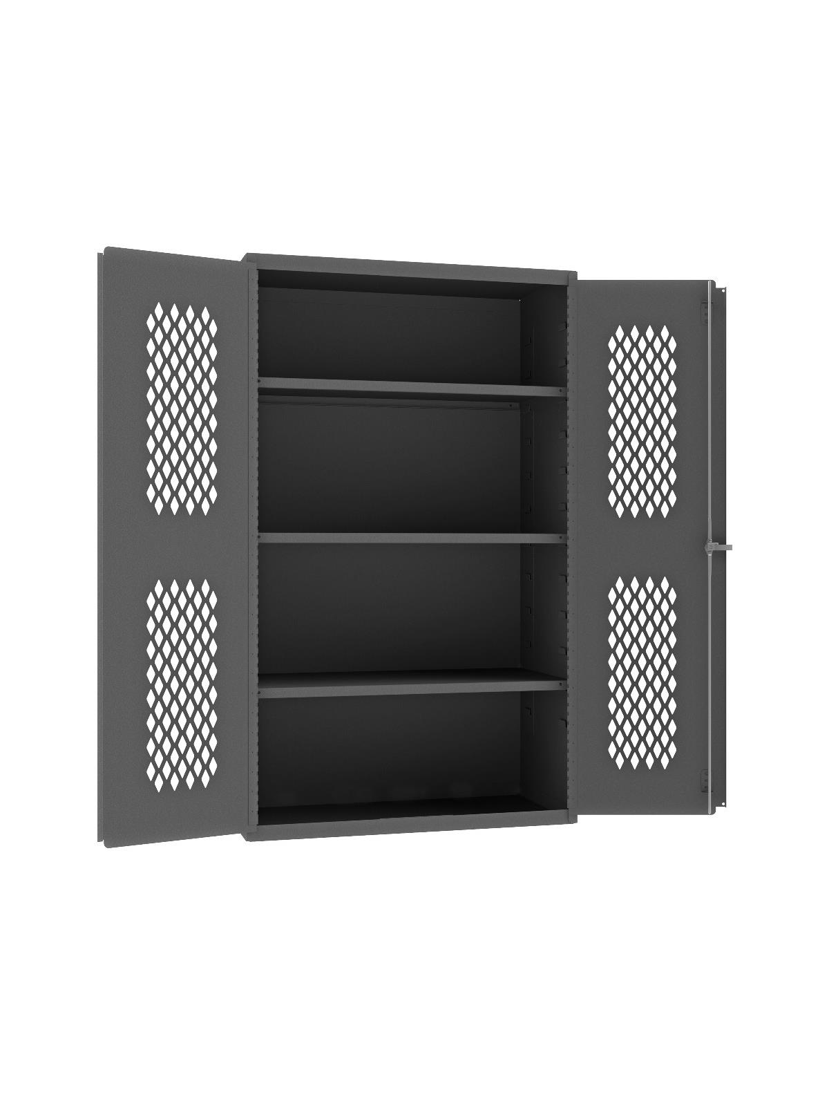 Punched diamond pattern in doors allows content visibility and ventilation. 3-point locking system with keyed handle and lock rods. 4 keys included. Full height, formed and recessed doors with heavy duty, leaf hinges to prevent sagging and warping. Adjustable shelves rest on louvered uprights and adjust on 4" centers (no tools required). Durable, gray, textured powder coat finish. FOB Shipping Point.