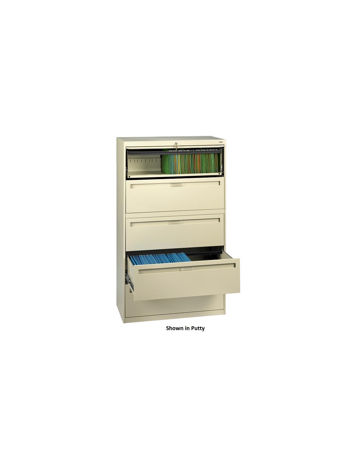 Drawers and doors have easy grip, full-width pulls with recessed label holders. Four leveling glides allow the unit to be leveled on uneven floors. To reduce risk of tipping, order two drawer lateral files with counterweights (suffix "W") for all applications except under a work surface in a workstation. Five and six-high units have retractable door(s) with roll-out drawer on top opening(s). Durable powder-coat paint finish.