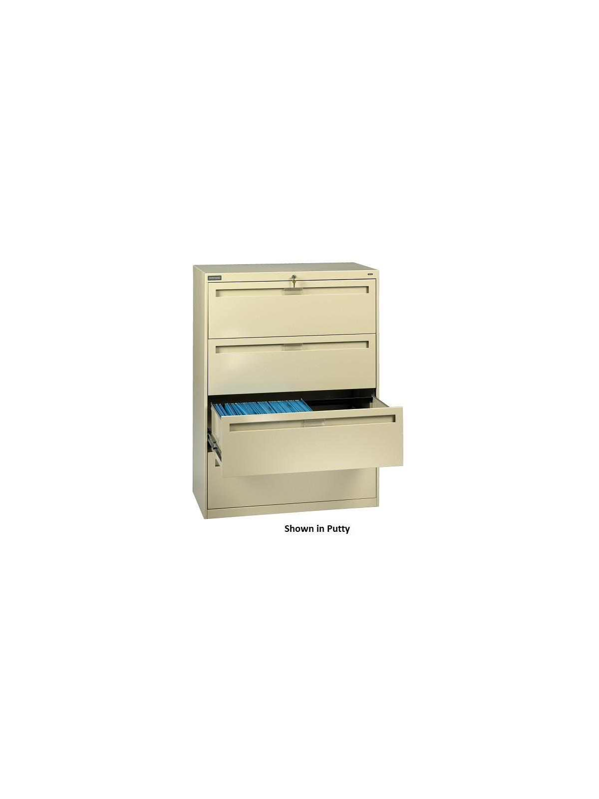 Drawers and doors have easy grip, full-width pulls with recessed label holders. Four leveling glides allow the unit to be leveled on uneven floors. To reduce risk of tipping, order two drawer lateral files with counterweights (suffix "W") for all applications except under a work surface in a workstation. Five and six-high units have retractable door(s) with roll-out drawer on top opening(s). Durable powder-coat paint finish.