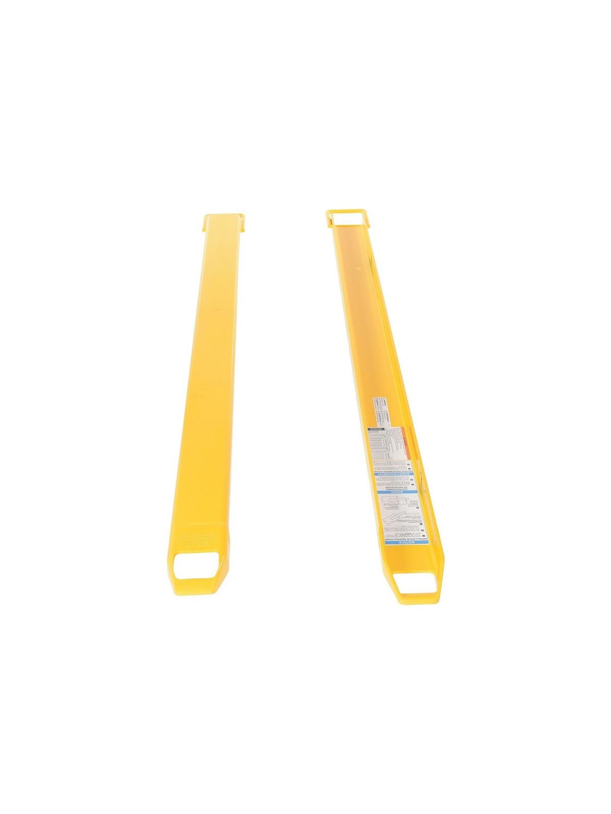 Rugged and durable welded steel construction with cast steel fork tips. Steel retaining strap prevents fork extensions from sliding off forks during use. Extensions are put on by sliding them up the fork at a 45° angle. OSHA regulations require that extensions are no more than 150% of the existing fork length. Powder coat Yellow finish. FOB Shipping Point. Due to tariffs and market conditions, pricing subject to change. See Related Items tab for High Strength Fork Extensions.