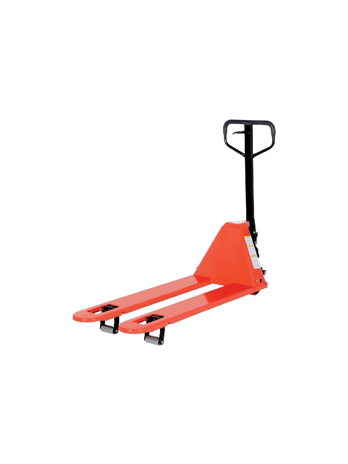 Steering wheels include precision bearing and dust covers for added life. Nose wheels are located on the front edge of each fork to assist in clean pallet entrance and exit. 2 entry wheels facilitate easy entry and 2 exit rollers make disengagement much smoother. Reinforced triple-formed forks. Internally mounted solid steel adjustable push rods. Spring loaded loop handle automatically returns to vertical position when not in use. Hydraulic pump design facilitates easy-access seal replacement. Chrome plated hydraulic pump piston for long seal life. Red baked-in powder-coated toughness. FOB Shipping Point. Due to tariffs and market conditions, pricing subject to change.