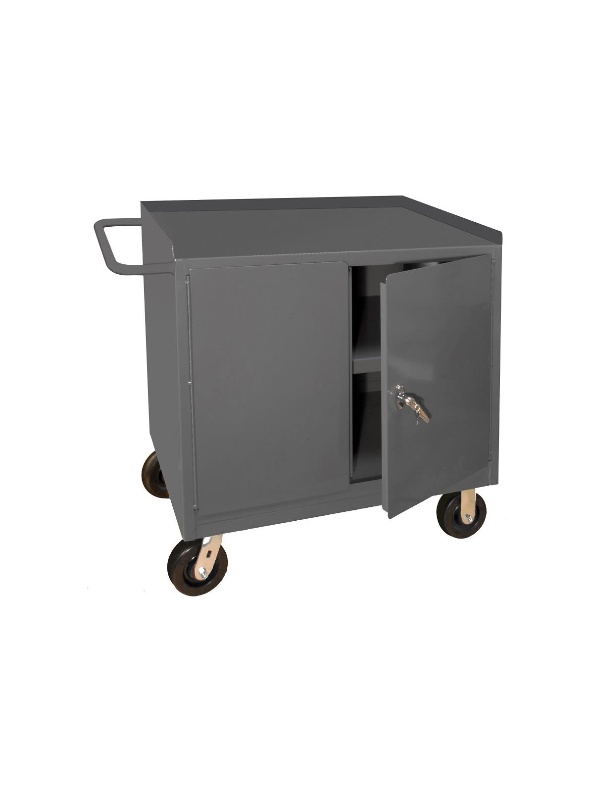 Choose from two models to store, sort and organize. High capacity, heavy-duty mobile cabinets combine storage, security, mobility and a work surface. Ideal for factories, warehouses or offices. Doors swing effortlessly, thanks to full length piano hinges. Doors also feature three-point locking handle and two keys. Casters are 6" x 2" phenolic bolt-on, two swivel and two rigid. Capacity of 2,000 lbs. Gray powder coat finish. FOB Shipping Point. Steel surcharges may apply.