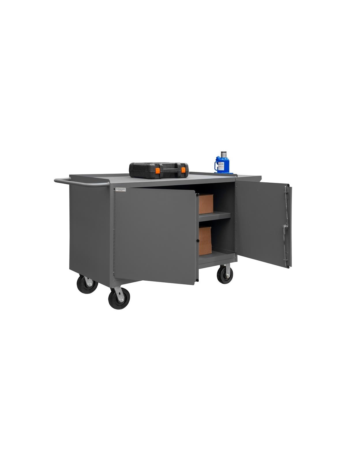 Choose from two models to store, sort and organize. High capacity, heavy-duty mobile cabinets combine storage, security, mobility and a work surface. Ideal for factories, warehouses or offices. Doors swing effortlessly, thanks to full length piano hinges. Doors also feature three-point locking handle and two keys. Casters are 6" x 2" phenolic bolt-on, two swivel and two rigid. Capacity of 2,000 lbs. Gray powder coat finish. FOB Shipping Point. Steel surcharges may apply.