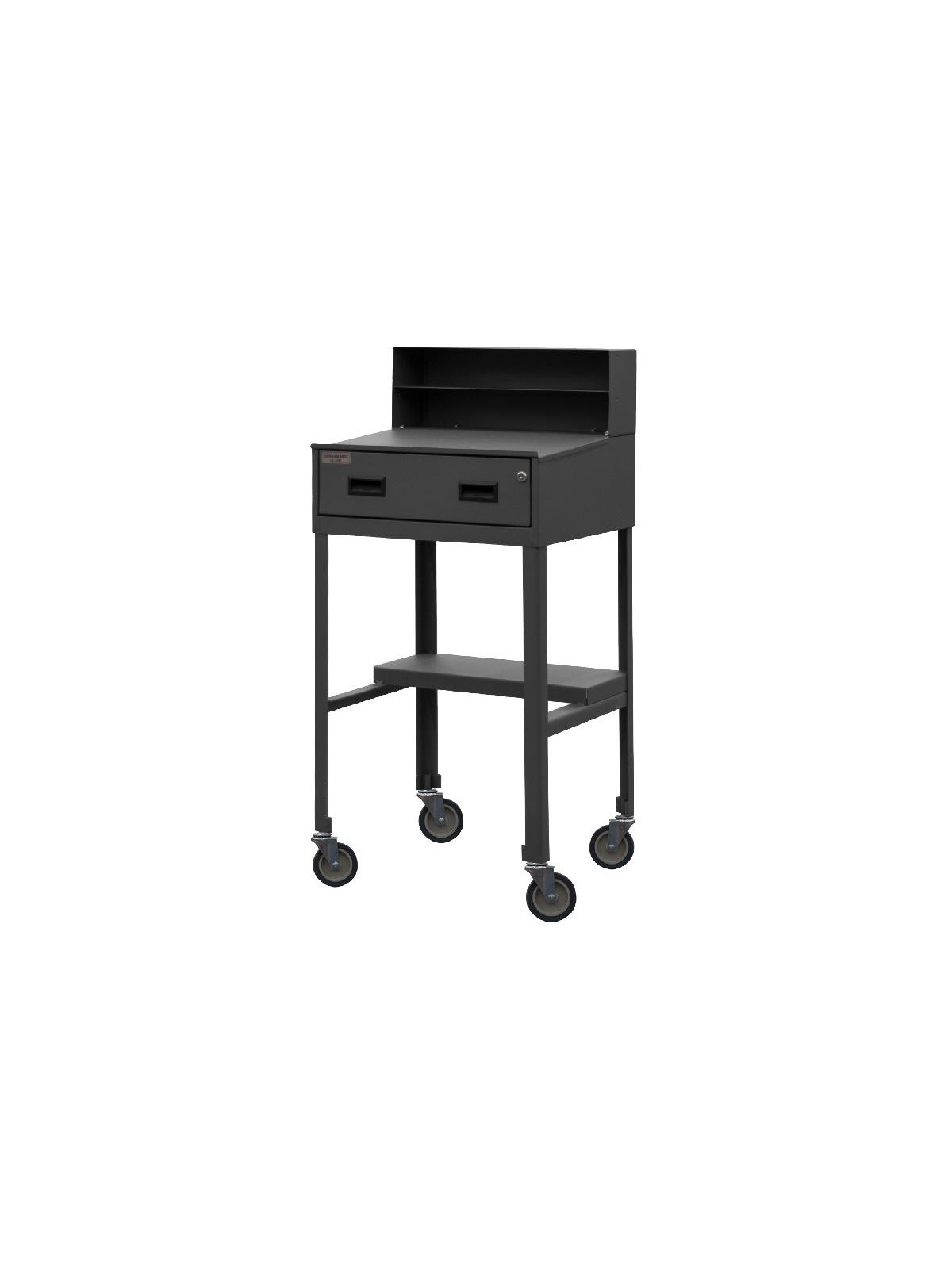 HMSD-2023-95 - Features a sliding drawer with cylinder lock and compartments for storing pens, pencils and more. Lip at base of work surface keeps items from falling off the sloped top. Rolls on four 3" rubber swivel plug-in casters. Gray powder coat finish. Shipped assembled and ready for use. HFED-2023-95 - Features 2 sliding drawers with compartments for storing pens, pencils and more. Lower storage compartment has a single point locking handle. 2 keys are provided. Lip at base of work surface keeps items from falling off sloped top. Rolls on four 3" rubber swivel plug-in casters. Gray powder coat finish. Minimal assembly required.
