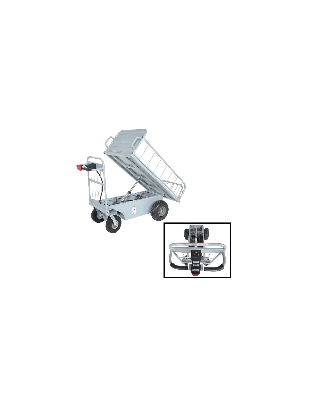 The off-road traction drive powered cart is a great fit on the farm or in the factory. Two (2) 12V batteries are included for immediate use. Rubber pneumatic tires provide the stability that is needed when traversing uneven, rough, surfaces. On model HOROAD-1000-T, platform tilts to a maximum of 40 degrees. FOB Shipping Point.