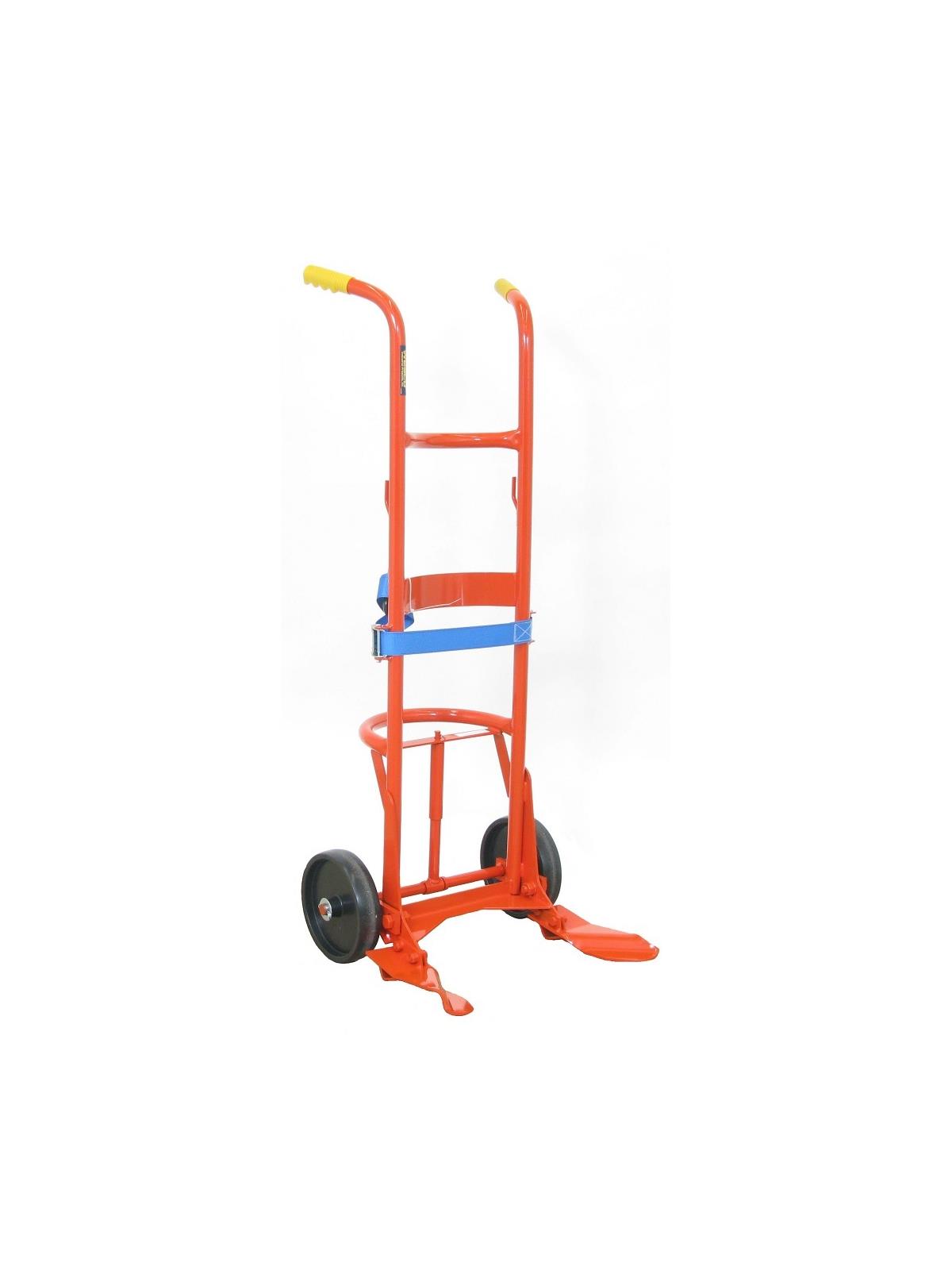 Recommended primarily for handling of 85 gallon overpacks. Long belt allows truck to handle all poly drums. Replaceable "feet" and belt. Wide "feet" and belt eliminate the risk of drums being punctured by nose prongs and chime hooks. Floating axle reduces effort required to break over and balance the load. 23.5"D. Patented design.