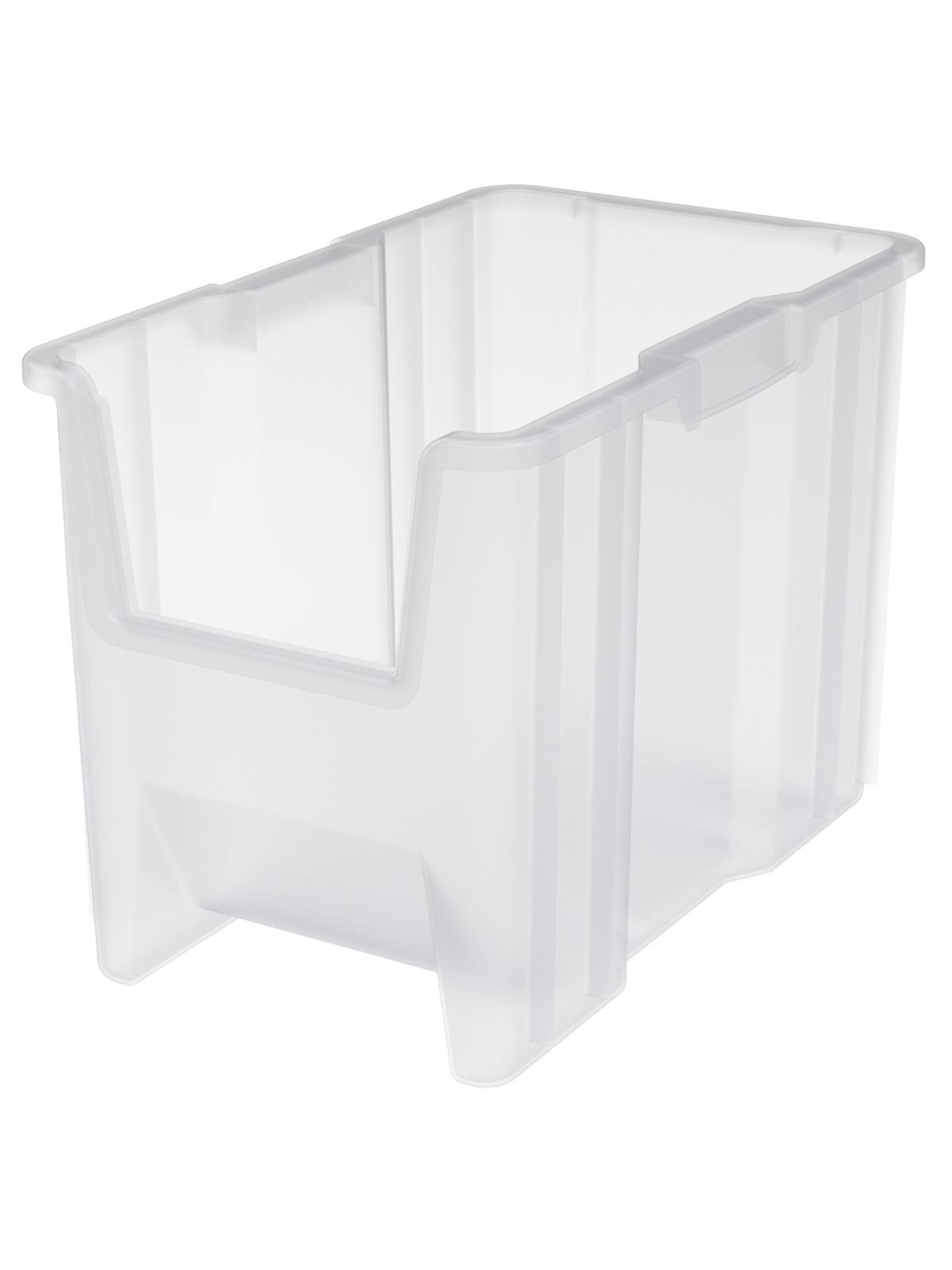 Built tough for 75 lb. load capacity. Features large comfort grip handles. Large radius corners and a curved upper lip add strength. Side ribs insure stability when stacked. Wide-hopper front allows easy access. Available in Blue, Gray or Clear. H13017 also available in White. FOB Shipping Point. Stack bins together to form a storage system. See Related Items tab for Stak-N-Store Wire Systems. Surcharge may apply.