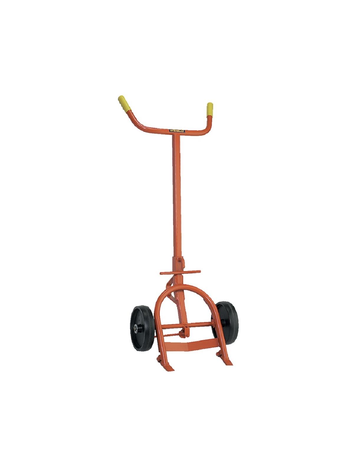 Machined steel load wheels behind nose prong help ease the lifting of drum. Classic single bar frame design. Kickstand. 24"W. at handle. 16.25"W. at nose.