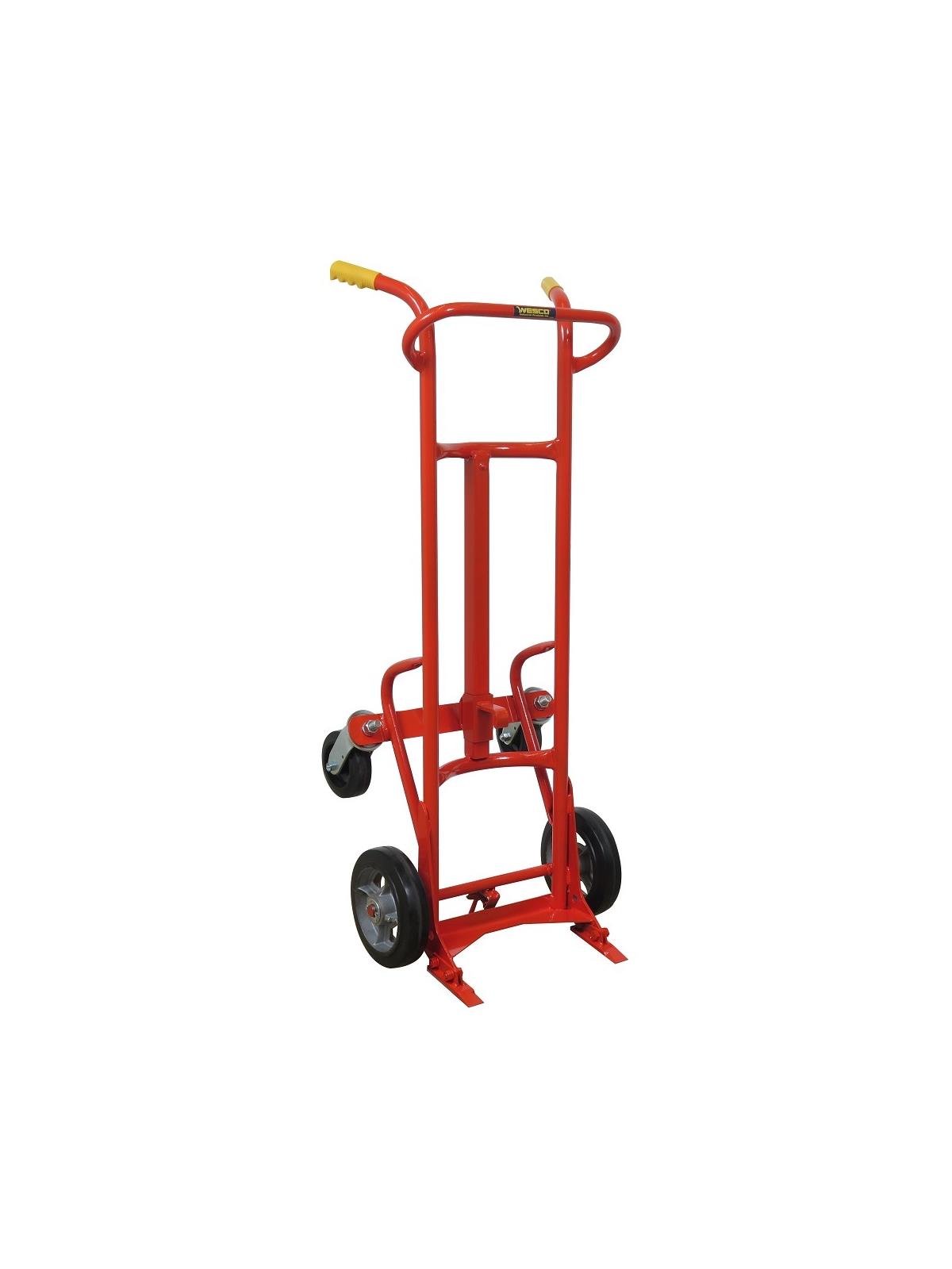 All trucks can be stored in the upright position. Safe, one-man handling of heavy 55 gal. drums. Features vinyl hand grips. FOB Shipping Point. Steel surcharges may apply. A) Floating Axle Ergonomic Drum Truck Easier drum truck for one person to handle. Floating axle reduces effort required to break over and balance the load. Chime hook can be stored at the top of frame. Self-standing. Replaceable hard double-beveled nose prongs. B) Economy Series Drum Truck (not shown) Affordable and durable. Angular steel base design. Kickstand. 24"W. at handle. 16.25"W. at nose. C) Standard Series (not shown) Machined steel load wheels behind nose prong help ease the lifting of drum. Classic single bar frame design. Kickstand. 24"W. at handle. 16.25"W. at nose. D) Deluxe Series Four Wheel design enables user to quickly and easily load and unload drums from pallet. Rear 6" wheels stabilize the load for effortless transport. Replaceable hard double-beveled nose prongs. Self-storing chime hook. Kickstand. 16.25"W. at nose. E) Ergonomic Drum Truck (not shown-similar to Deluxe Series, but with rear swivel casters) Ergonomic swivel caster design reduces operator muscle strain and fatigue. Swivel casters allow for smooth and tight turns in congested areas and provide 4 wheel support. Not recommended for use with pallets. Replaceable hard double-beveled nose prongs. Kickstand. 16.25"W. at nose. F) Drum Truck w/ Drain Stand Multi-functional drum truck allows four wheel drum handling and acts as a drum cradle for storage or dispensing. Frame clearance for dispensing into 5 gal. pails. Real axle allows for loading and unloading of drums from pallets. Kickstand. 16.5" drain height. FOB Shipping Point.