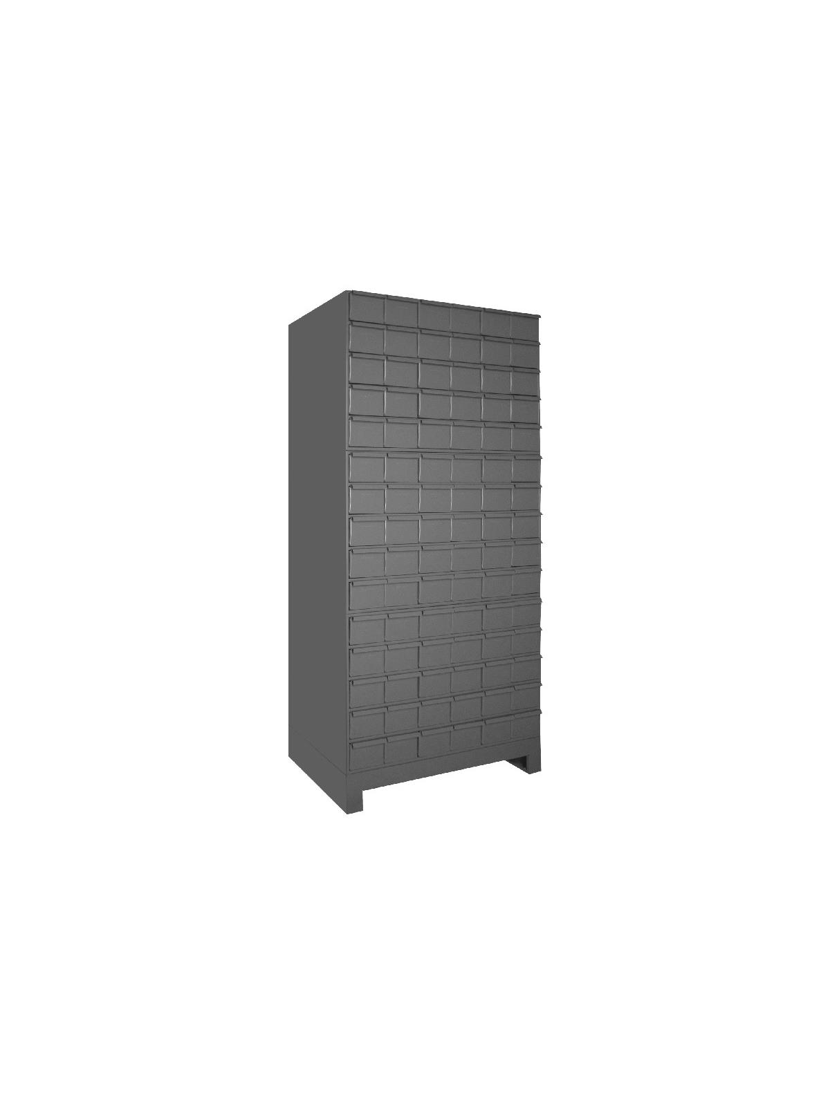 Full-width handle drawers open easily thanks to two embossed runners.  Positive stop prevents spilling. Each drawer comes with 2 dividers. Shipped assembled. Includes base. Gray powder coat finish. FOB Shipping Point.