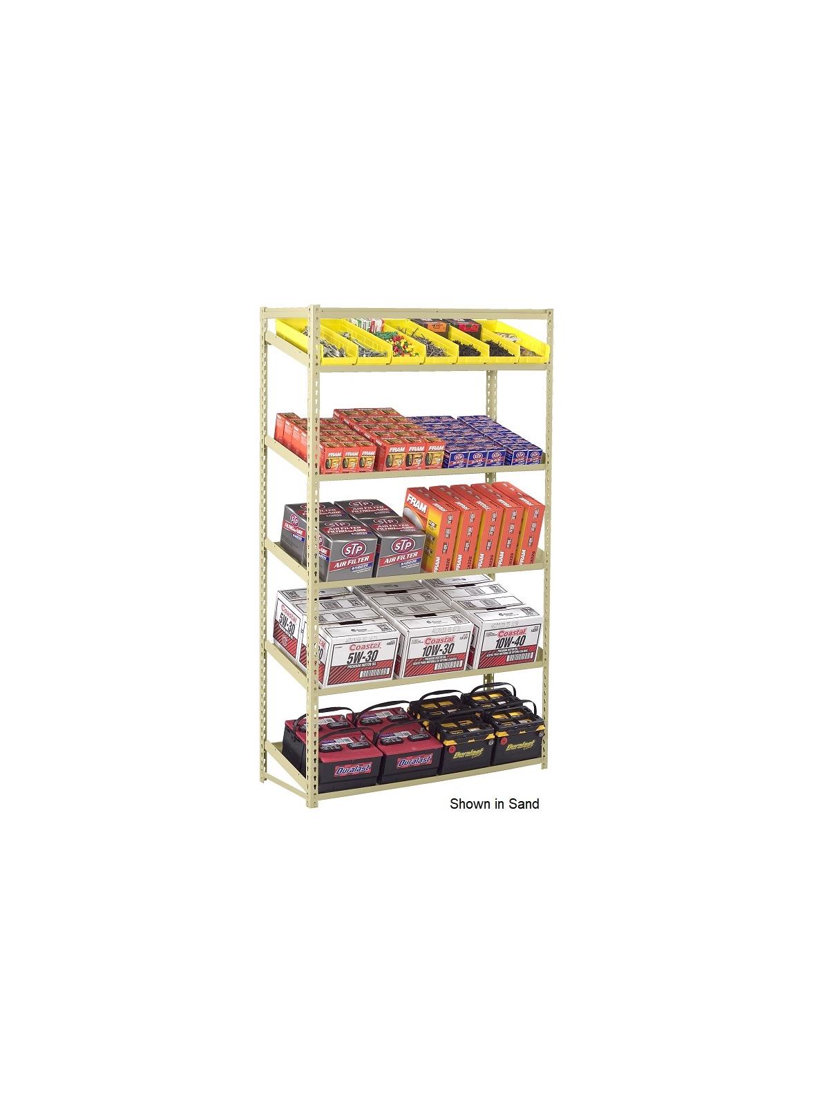 Parts, bins and boxes slide forward for easy picking. Open access from all sides. Place back to back to double shelf depth. Canopy top has box formed construction. Features 2" side flange to retain product. 1/2" front lip acts as a product stop. Heavy gauge shelf supports. Shelves support up to 450 lb. loads. Boltless construction - easy assembly with only a mallet. 5 sloping steel shelves per unit. 18"D. shelves slope 12 degrees. 24"D. shelves slope 14 degrees. Starter unit can be used individually or combined with adder units to form a row of shelving. Medium Gray or Sand finish. FOB Shipping Point. Surcharge may apply.