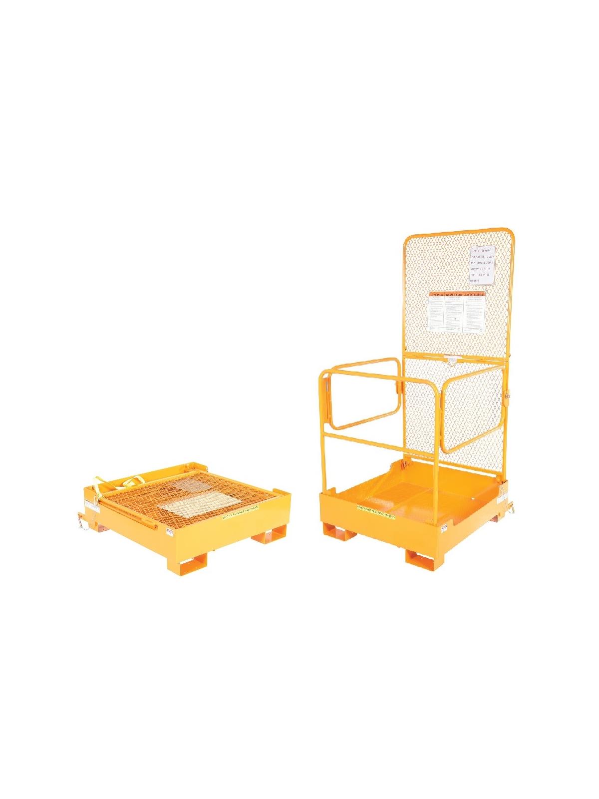 Convenient fork truck work platforms quickly and safely raise maintenance personnel where they are needed. Attaches to fork lift truck by inserting forks into fork pockets and securing platform to fork truck. Fork locks secure platform to forks and a 36" long safety restraint which hook attaches platform to fork truck. 42" high handrail with 21" high mid-rail on three sides. 60" high expanded metal backing on forth side (84" high backing to meet California OSHA available, call for details). Includes diamond plate platform. The usable fork pockets on single and dual side door entry are 7-3/4"W x 3-7/8"H in rear and 7-3/4"W x 1-7/8"H in front. The usable fork pockets on fold down work platform measure 7-7/8"W x 3-3/8"H on 27-3/4" centers. Steel construction with baked-in powder-coated toughness. FOB Shipping Point.